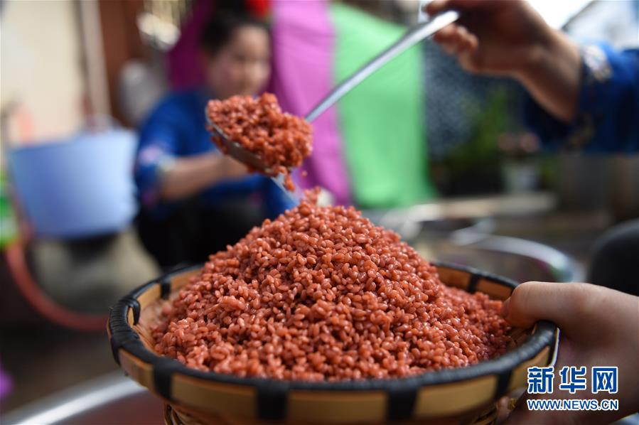 4月16日,在貴州省臺江縣姊妹街哆蝶五彩姊妹飯?bào)w驗(yàn)店,苗家婦女展示制作五彩“姊妹飯”的糯米。新華社發(fā)(劉開福 攝)