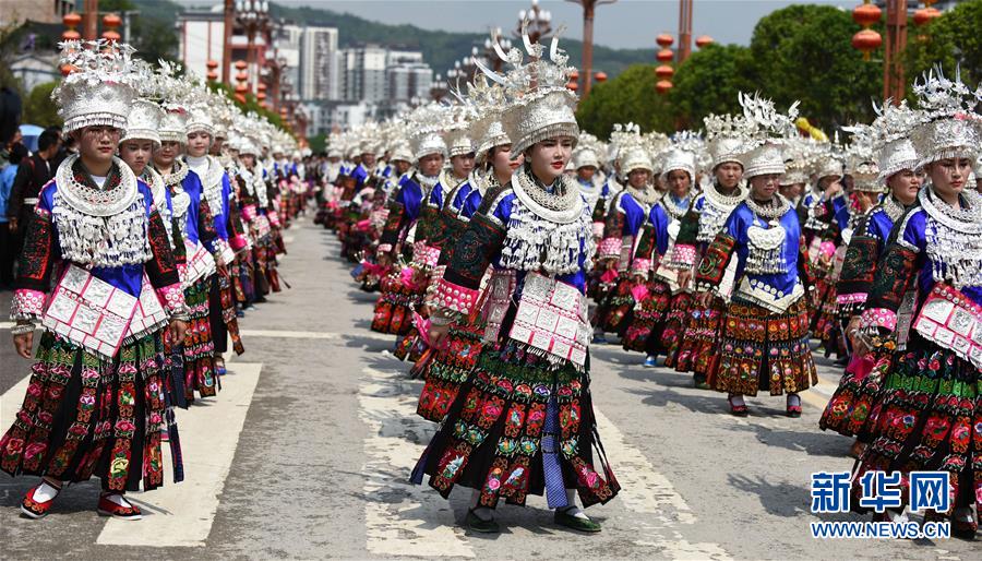 4月18日,臺江縣苗族群眾參加盛裝游演活動。 當(dāng)日,貴州省黔東南苗族侗族自治州臺江縣迎來一年一度的苗族姊妹節(jié)。節(jié)日期間將舉行苗族盛裝游演、千人長桌宴、千人游方體驗、苗族手工創(chuàng)意大賽等一系列活動。 姊妹節(jié)是臺江縣苗族同胞的傳統(tǒng)節(jié)日,2006年被列入第一批國家級非物質(zhì)文化遺產(chǎn)名錄。 新華社記者 楊文斌 攝