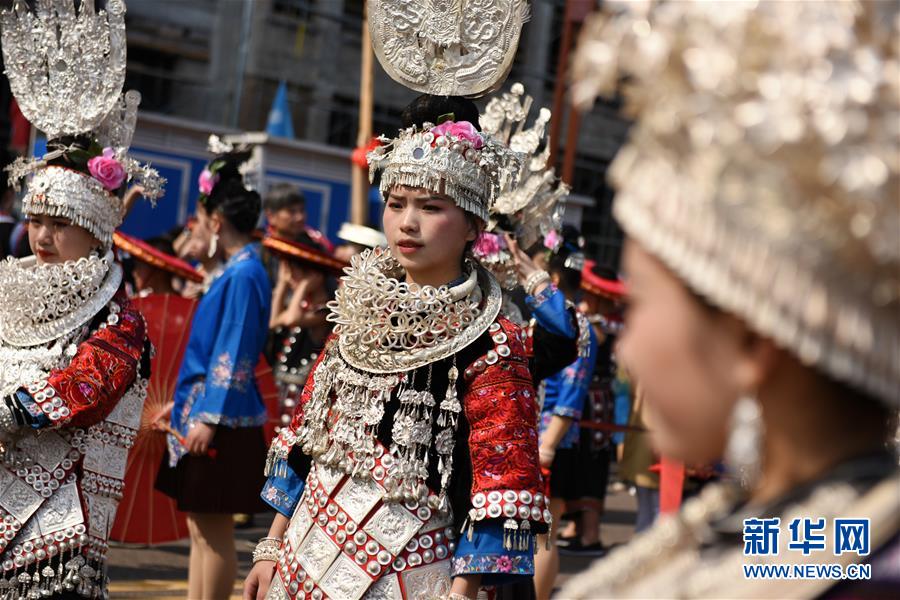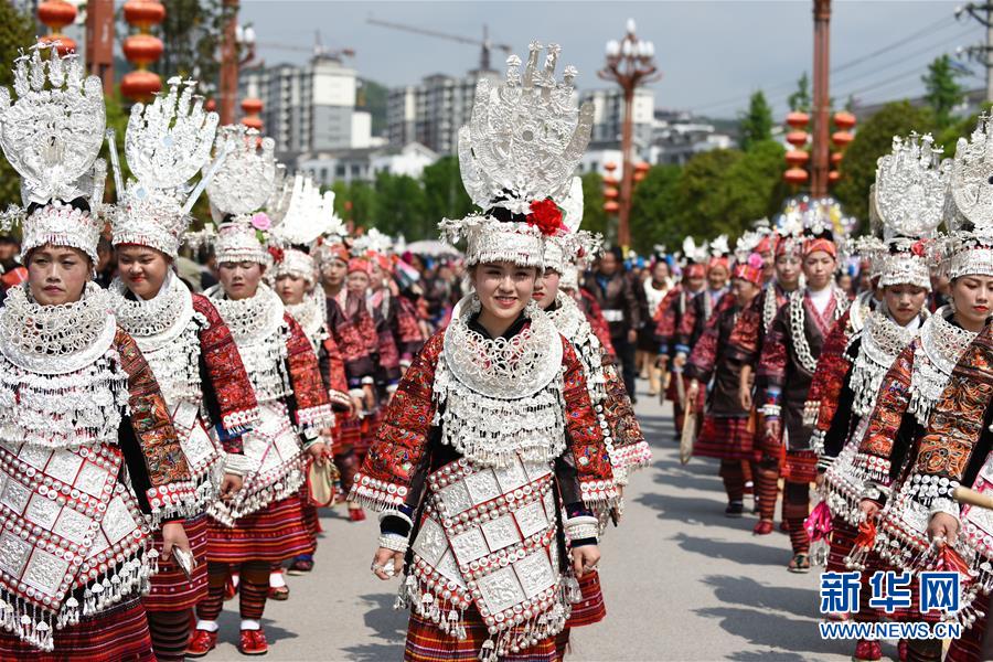 4月18日,臺江縣苗族群眾參加盛裝游演活動。 當(dāng)日,貴州省黔東南苗族侗族自治州臺江縣迎來一年一度的苗族姊妹節(jié)。節(jié)日期間將舉行苗族盛裝游演、千人長桌宴、千人游方體驗(yàn)、苗族手工創(chuàng)意大賽等一系列活動。 姊妹節(jié)是臺江縣苗族同胞的傳統(tǒng)節(jié)日,2006年被列入第一批國家級非物質(zhì)文化遺產(chǎn)名錄。 新華社記者 楊文斌 攝