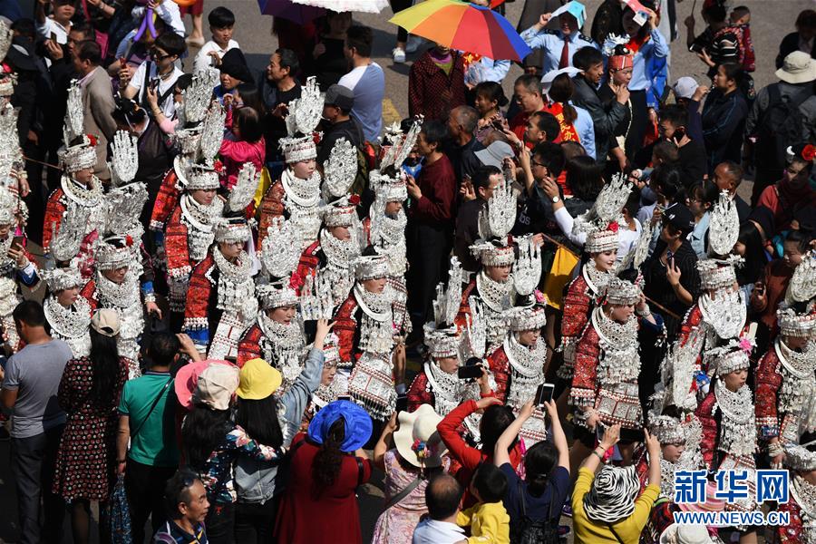4月18日,臺江縣苗族群眾參加盛裝游演活動。 當(dāng)日,貴州省黔東南苗族侗族自治州臺江縣迎來一年一度的苗族姊妹節(jié)。節(jié)日期間將舉行苗族盛裝游演、千人長桌宴、千人游方體驗、苗族手工創(chuàng)意大賽等一系列活動。 姊妹節(jié)是臺江縣苗族同胞的傳統(tǒng)節(jié)日,2006年被列入第一批國家級非物質(zhì)文化遺產(chǎn)名錄。 新華社記者 楊文斌 攝