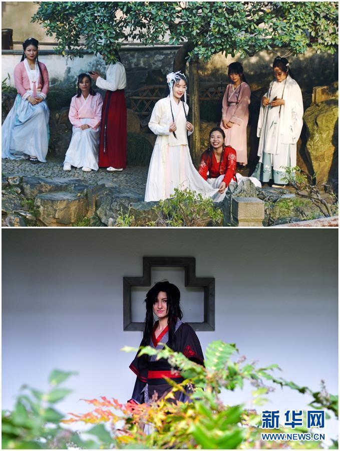 這張拼版照片展示的是:上圖,2019年4月1日,游客在中國(guó)蘇州耦園內(nèi)身著古裝拍照(新華社記者杜涓涓攝);下圖,2019年4月13日,一名當(dāng)?shù)赜慰驮诘聡?guó)曼海姆中式園林“多景園”內(nèi)身著古裝拍照(新華社記者逯陽(yáng)攝)。