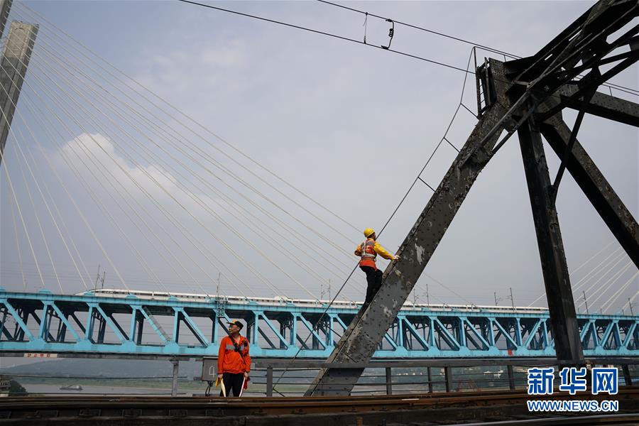 中國鐵路成都局有限公司重慶工務段的巡檢班組在白沙沱長江大橋上等待機車通過后繼續(xù)作業(yè)(4月23日攝)。 4月23日下午5點40分,隨著重慶白沙沱長江大橋通行的最后一列客運列車順利通過,這座“服役”了59年的重慶首座長江大橋進入“退役”倒計時。4月24日后,所有列車將改線經(jīng)距白沙沱長江大橋約100米的新白沙沱長江特大橋通行,新橋“接力”老橋,運輸能力將得到大幅提升。 白沙沱長江大橋于1958年開工,1960年通過首趟列車,是繼武漢長江大橋之后的第二座長江大橋。 新華社記者 劉潺 攝