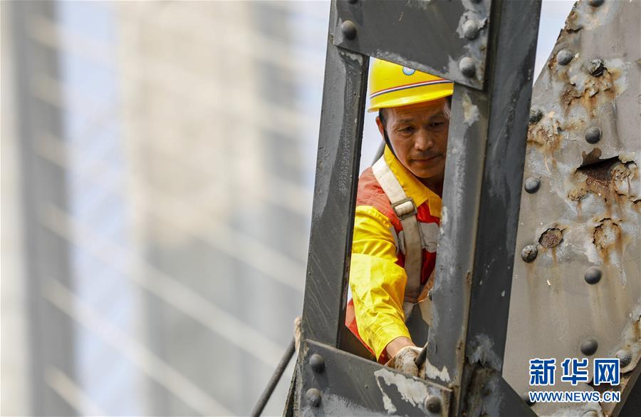 中國(guó)鐵路成都局有限公司重慶工務(wù)段53歲的橋隧工唐金華在白沙沱長(zhǎng)江大橋的鋼架上檢查鋼梁的銹蝕情況(4月23日攝)。 4月23日下午5點(diǎn)40分,隨著重慶白沙沱長(zhǎng)江大橋通行的最后一列客運(yùn)列車順利通過(guò),這座“服役”了59年的重慶首座長(zhǎng)江大橋進(jìn)入“退役”倒計(jì)時(shí)。4月24日后,所有列車將改線經(jīng)距白沙沱長(zhǎng)江大橋約100米的新白沙沱長(zhǎng)江特大橋通行,新橋“接力”老橋,運(yùn)輸能力將得到大幅提升。 白沙沱長(zhǎng)江大橋于1958年開工,1960年通過(guò)首趟列車,是繼武漢長(zhǎng)江大橋之后的第二座長(zhǎng)江大橋。 新華社記者 劉潺 攝