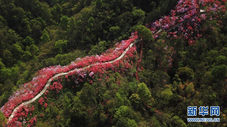 安徽省岳西縣天峽風(fēng)景區(qū)內(nèi)的杜鵑花競(jìng)相綻放(4月12日無(wú)人機(jī)拍攝)。 新華社記者 張端 攝