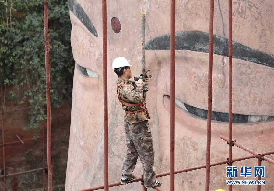 工人在搭建腳手架(10月19日攝)。 經(jīng)過17天緊張施工,10月25日下午,正在“體檢”的樂山大佛腹部以下的腳手架搭設(shè)完畢,這表明大佛“體檢”已觸達(dá)胸腹部及頭部等核心區(qū)域。 新華社記者張超群攝