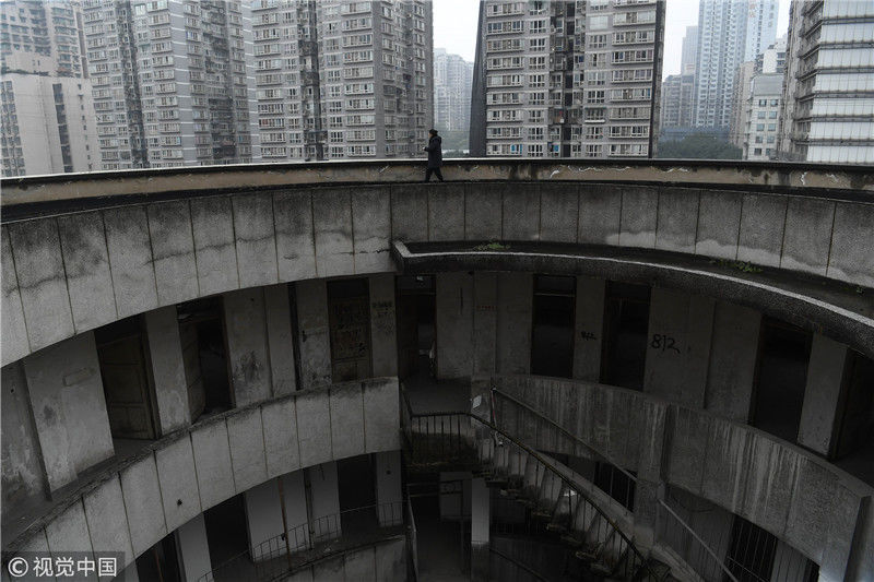 2018年12月11日,重慶紅旗河溝汽車站辦公大樓。八層的圓筒型轉(zhuǎn)轉(zhuǎn)樓,站在樓里往上望,可以看見碗口大的天空。圖片作者:尋常
