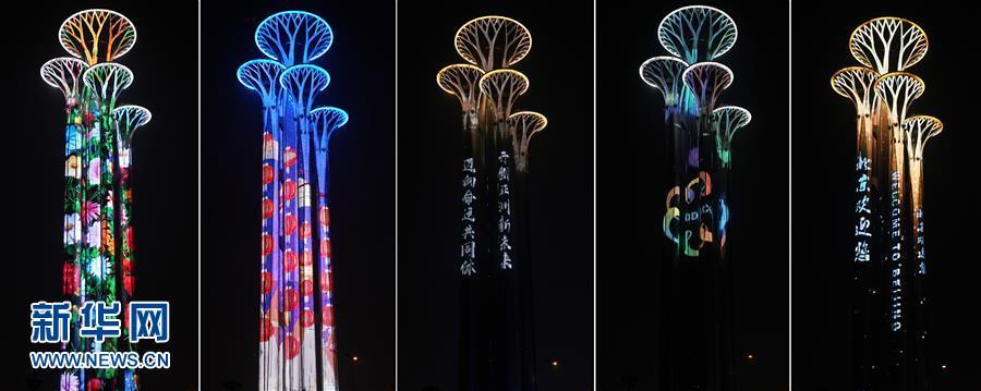 奧林匹克塔上演“空間光影秀”(拼版照片,5月14日攝)。 當(dāng)晚,一場(chǎng)“空間光影秀”在北京上演。 新華社記者 鞠煥宗 攝