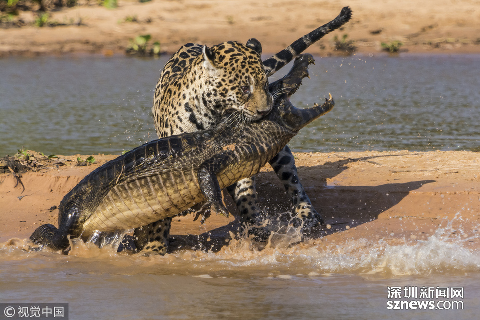 當(dāng)?shù)貢r間2013年8月25日,巴西潘特納爾,一頭雄性美洲豹攻擊了一條巴拉圭凱門鱷并與之纏斗。這只美洲豹預(yù)先躲在水中匍匐前進(jìn),然后突然出現(xiàn)把這只鱷魚震住,隨后用牙刺進(jìn)鱷魚的堅(jiān)硬的外殼中,將其拖入?yún)擦帧?/p>