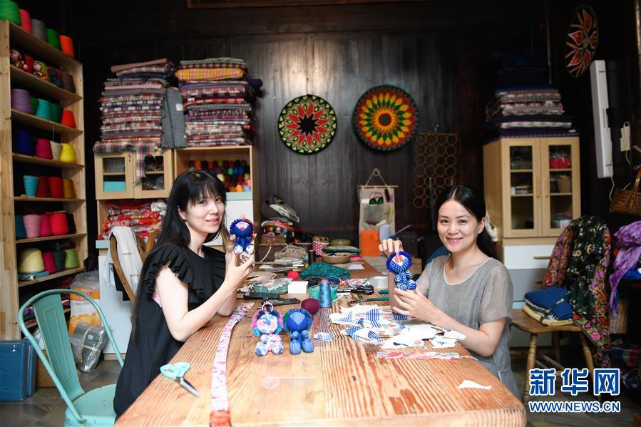 5月26日,在石舍村共同經(jīng)營“三只蝸?!笔止に嚻飞痰旰涂蜅5慕忝藐愖袭嫞ㄓ遥?、陳莫寒在展示制作的手工藝品。 石舍村是浙江省桐廬縣富春江鄉(xiāng)村慢生活體驗區(qū)中的三個村落之一,位置偏僻,依溪而居,風(fēng)景秀美。近年來,石舍村結(jié)合古建筑保護工作,在清潔、美化村莊的基礎(chǔ)上,對一些廢棄古建筑進行修繕,引入咖啡館、民宿等文化創(chuàng)意類項目,優(yōu)良的生態(tài)環(huán)境和濃郁的文化氛圍吸引大批游客前來體驗,小山村走上了一條發(fā)展美麗經(jīng)濟之路。2018年,石舍村接待游客10萬8千余人次,旅游經(jīng)營凈收入1260余萬元。 新華社記者 黃宗治 攝