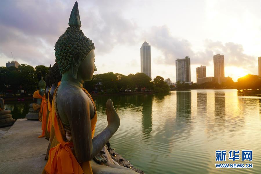 這是夕陽下的斯里蘭卡科倫坡水中廟佛像(5月27日攝)。 在科倫坡貝拉湖上有一座木造樓閣——水中廟。木造建筑上面覆蓋著藍(lán)瓦,外圍環(huán)繞著線條優(yōu)美的佛像。樓閣外高臺(tái)上供奉的佛像,與不遠(yuǎn)處的高層建筑相互映照。祥和寧靜的水中廟已成為人們修心、祈福的重要場所。 新華社記者唐璐攝