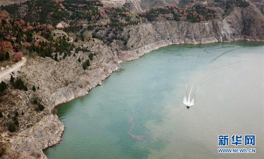 10月24日,一艘快艇從劉家峽水庫庫區(qū)駛過(無人機拍攝)。 新華社記者 陳斌 攝