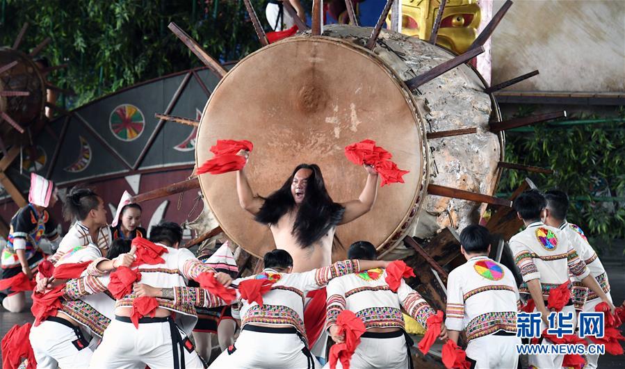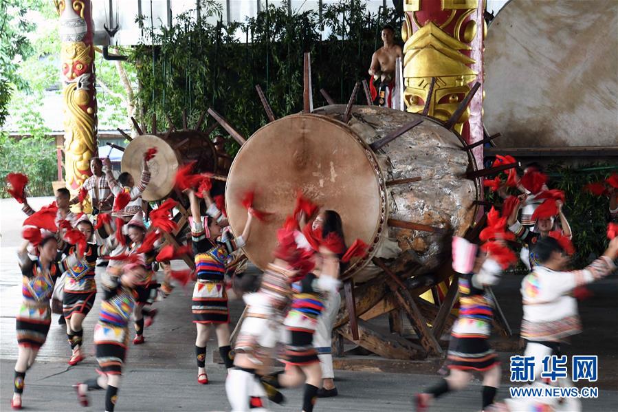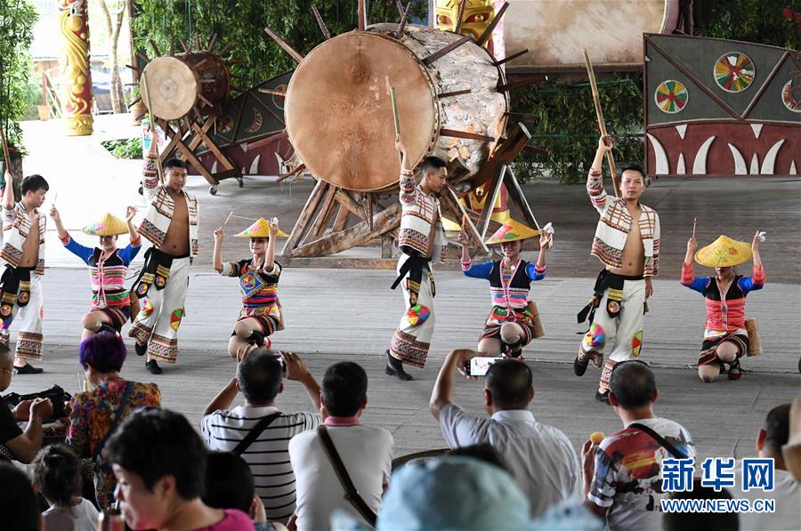 基諾族演員在表演大鼓舞(6月1日攝)。 在云南省西雙版納傣族自治州景洪市基諾山基諾族鄉(xiāng)的基諾族村寨,每天的基諾大鼓舞表演吸引了眾多游客前來(lái)觀賞體驗(yàn),帶動(dòng)了基諾族群眾就業(yè)和增收?;Z族大鼓舞蘊(yùn)涵豐富的歷史文化內(nèi)涵,已被列入國(guó)家級(jí)非物質(zhì)文化遺產(chǎn)保護(hù)名錄。 新華社記者 楊宗友 攝