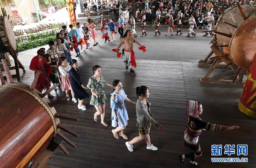 游客與基諾族大鼓舞演員一起跳舞(6月1日攝)。 在云南省西雙版納傣族自治州景洪市基諾山基諾族鄉(xiāng)的基諾族村寨,每天的基諾大鼓舞表演吸引了眾多游客前來(lái)觀賞體驗(yàn),帶動(dòng)了基諾族群眾就業(yè)和增收。基諾族大鼓舞蘊(yùn)涵豐富的歷史文化內(nèi)涵,已被列入國(guó)家級(jí)非物質(zhì)文化遺產(chǎn)保護(hù)名錄。 新華社記者 楊宗友 攝