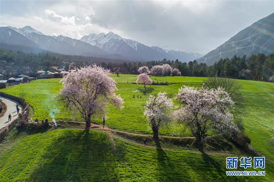 西藏林芝波密縣境內(nèi)桃花盛開的田園風(fēng)光(4月5日無人機拍攝)。