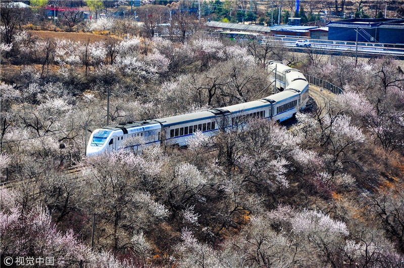 2019年3月22日,北京居庸關(guān)附近的山花盛開,S2線列車穿行在花海之中,構(gòu)成一幅美麗的畫面。時(shí)永平/千龍圖像/視覺中國 編輯/陳進(jìn)