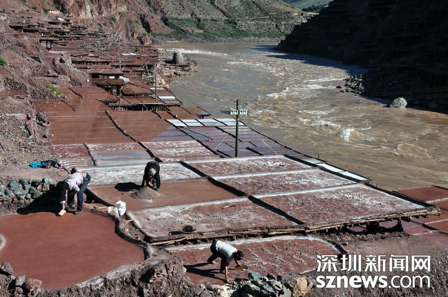西藏芒康縣納西民族鄉(xiāng)加達(dá)村村民在鹽田曬鹽(6月4日攝)。新華社記者晉美多吉攝