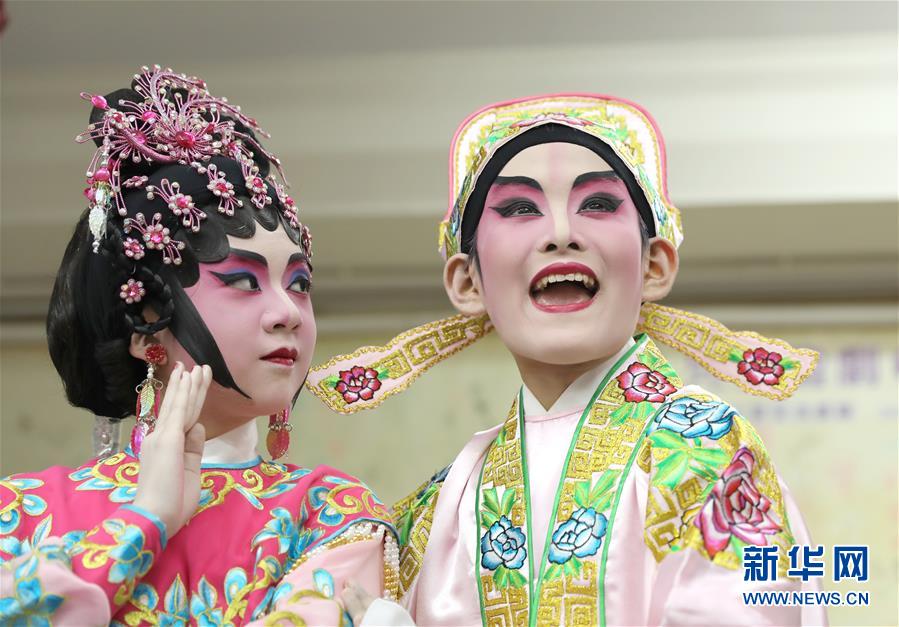 一群孩子和79歲的粵劇名伶楊劍華在一起(6月8日攝)。 聲輝粵劇推廣協(xié)會成立于2003年,是香港重要粵劇藝術(shù)團體之一,致力于向青少年推廣粵劇。協(xié)會目前有兩個初班,3個中班,一個青少年班?;泟∮址Q“廣東大戲”,表演技藝包括“唱做念打”,即唱功、身段、臺詞、武打,主要流行于廣東、廣西和香港、澳門等地區(qū)。2009年,粵劇被列入聯(lián)合國教科文組織人類非物質(zhì)文化遺產(chǎn)代表作名錄,今年正逢十周年。 新華社記者 吳曉初 攝