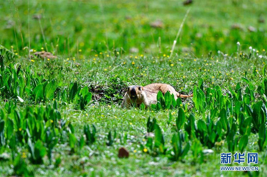 這是在青海省玉樹藏族自治州雜多縣昂賽鄉(xiāng)境內(nèi)拍攝的旱獺(6月21日攝)。 新華社記者 張龍 攝