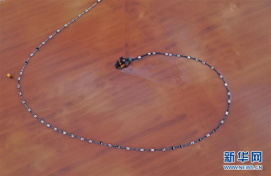 7月3日,唐山海港經(jīng)濟(jì)開(kāi)發(fā)區(qū)大清河鹽場(chǎng)的工人在操作機(jī)械設(shè)備收獲春鹽(無(wú)人機(jī)拍攝)。