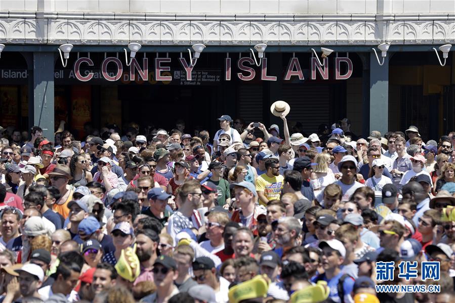 7月4日,在美國(guó)紐約康尼島,人們觀看吃熱狗大賽。新華社記者 李木子 攝
