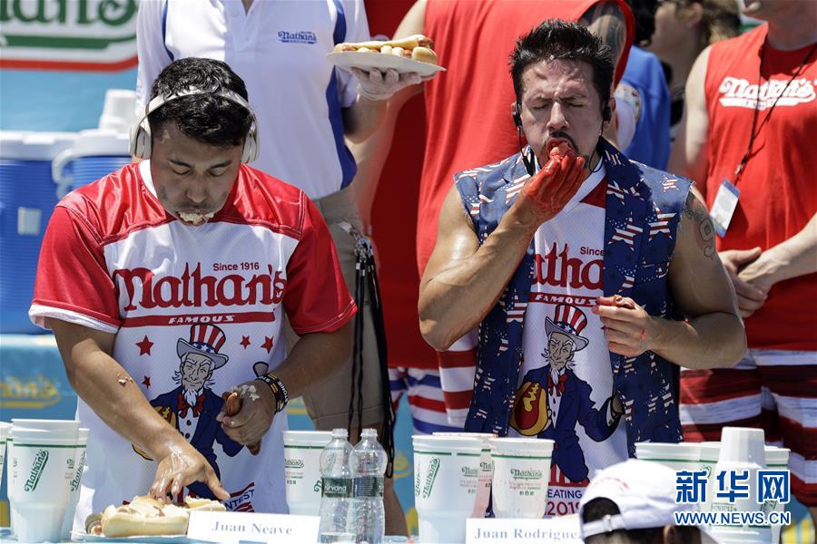 7月4日,在美國紐約康尼島,選手參加吃熱狗大賽。 新華社記者 李木子 攝