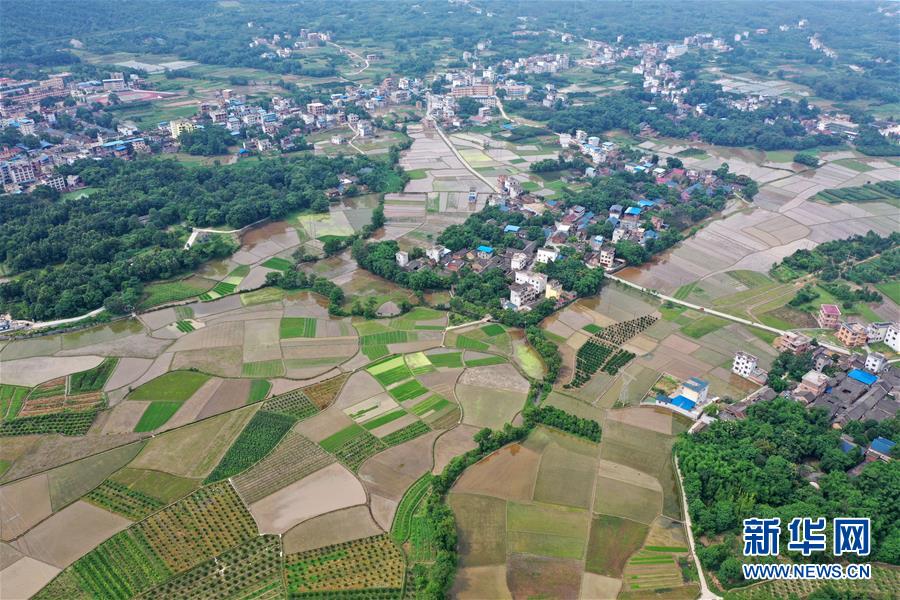 這是廣西全州縣鳳凰鎮(zhèn)鳳凰嘴渡口附近的田園(6月29日無人機(jī)拍攝)。 新華社記者 陸波岸 攝