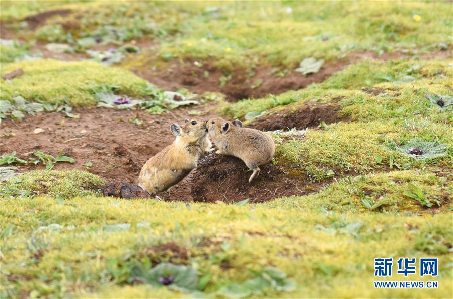 7月6日,兩只高原鼠兔在西藏思金拉錯(cuò)湖邊嬉戲。 新華社記者 周錦帥 攝
