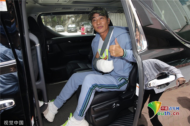 2019年7月24日,香港,任達(dá)華出院。他身穿藍(lán)色運動外套走出醫(yī)院,頭戴鴨舌帽,受傷的右手則套上白色護(hù)臂帶,面帶笑容,精神狀態(tài)非常好。