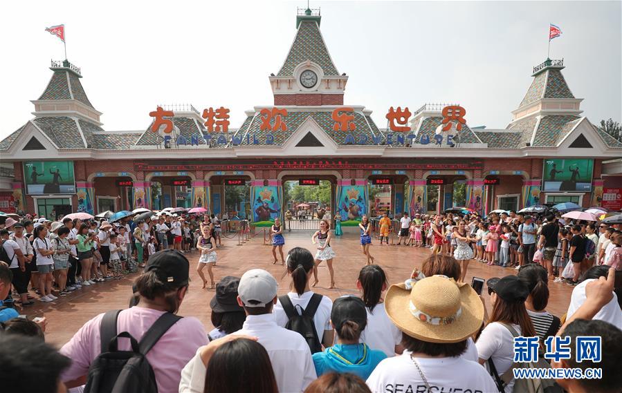 7月31日,列娜(前排左)在沈陽方特歡樂世界門前表演舞蹈。