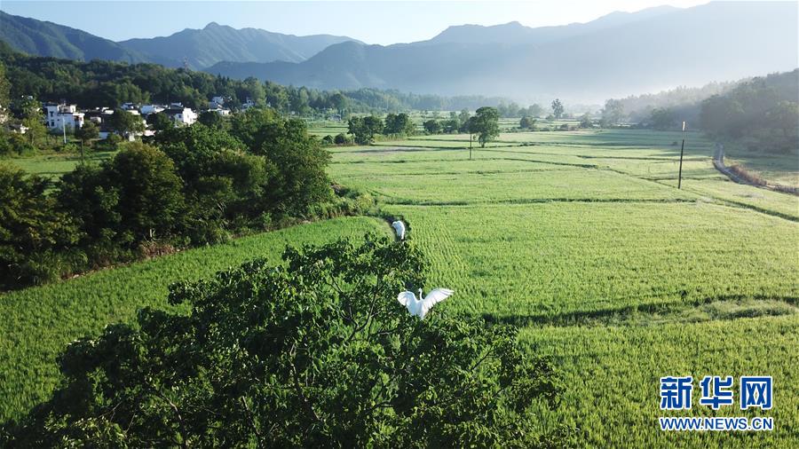 這是8月4日無人機(jī)拍攝的安徽黟縣宏村風(fēng)景區(qū)附近的農(nóng)田晨景。新華社記者 張端 攝