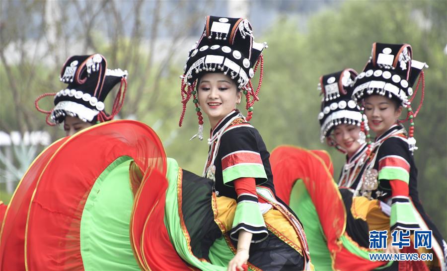 8月4日,來自貴州省黔東南苗族侗族自治州的演員在表演民族歌舞。新華社記者 李欣 攝