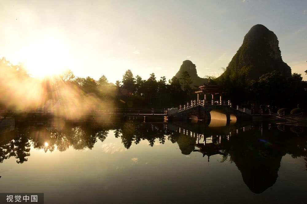 廣西桂林,晨光照映下,山水美景如畫。