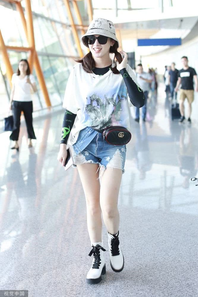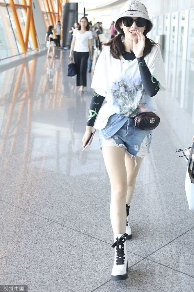 內(nèi)地女星彭小苒現(xiàn)身機場,穿印花T恤牛仔短褲,白色馬丁靴很時髦