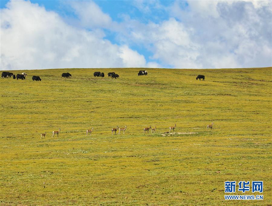 一群藏原羚在牦牛群旁駐足吃草(8月14日攝)。 8月12日至14日,來自全國各地的31名自然愛好者聚集在海拔4200米的青海省玉樹藏族自治州稱多縣嘉塘草原,參加“2019嘉塘自然觀察節(jié)”。自然愛好者用獨(dú)特視角記錄珍稀野生動(dòng)植物,觀察三江源生態(tài)。 新華社記者 田文杰 攝