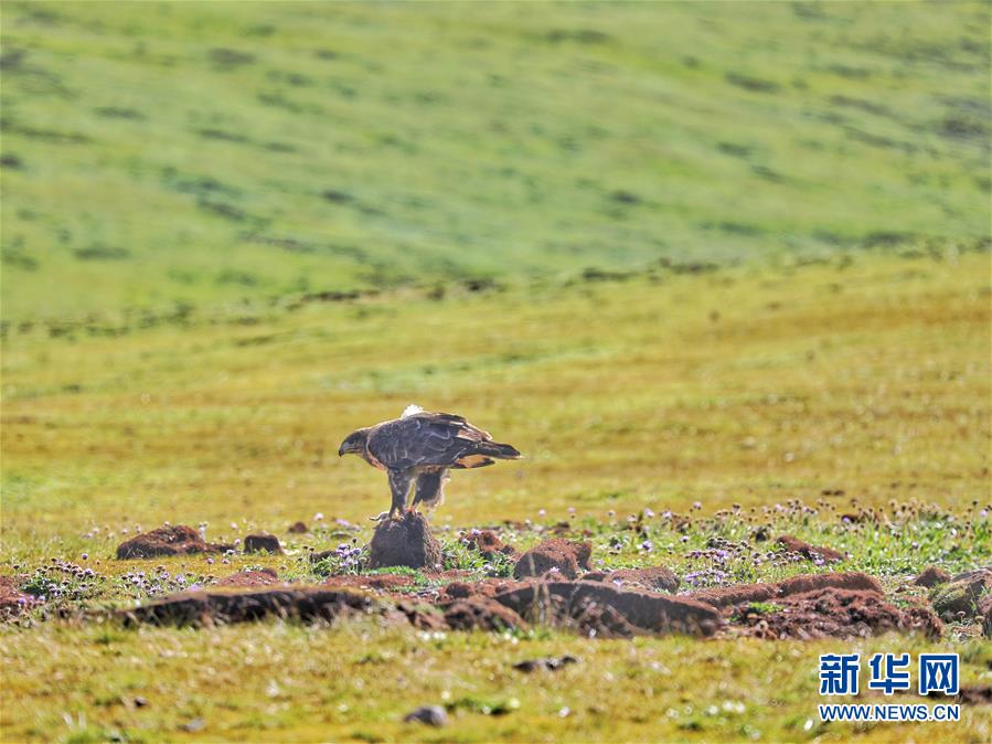 一只大鵟準(zhǔn)備享用捕獲的獵物(8月14日攝)。 8月12日至14日,來(lái)自全國(guó)各地的31名自然愛好者聚集在海拔4200米的青海省玉樹藏族自治州稱多縣嘉塘草原,參加“2019嘉塘自然觀察節(jié)”。自然愛好者用獨(dú)特視角記錄珍稀野生動(dòng)植物,觀察三江源生態(tài)。 新華社記者 張大川 攝