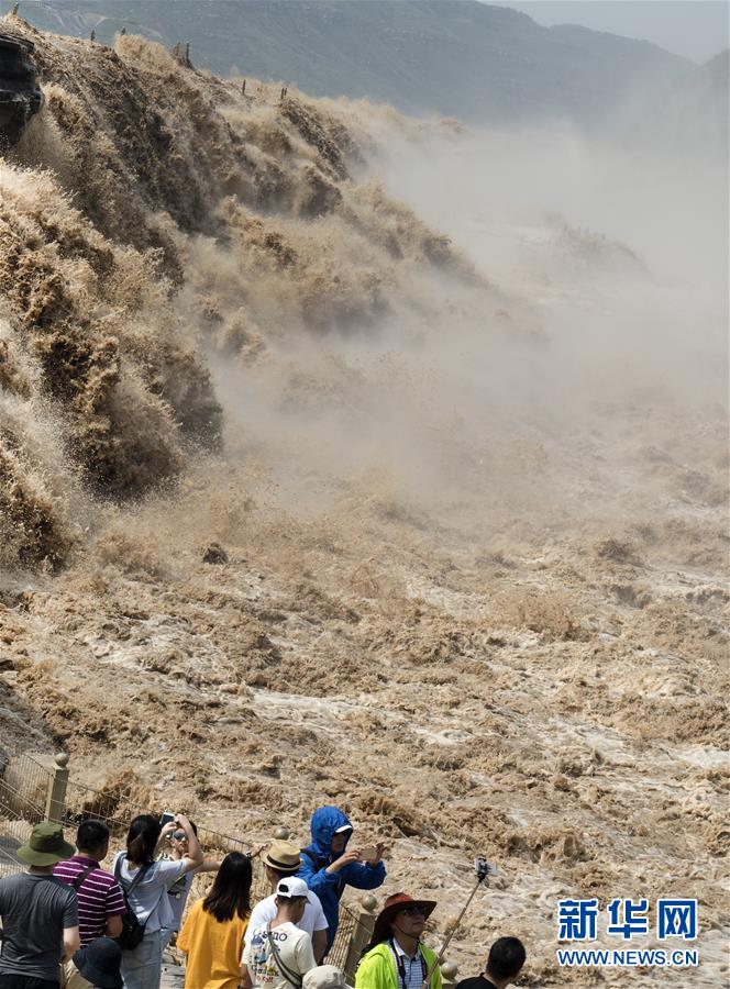 7月19日,游客在陜西境內(nèi)的壺口瀑布群前留影。 新華社記者陶明 攝