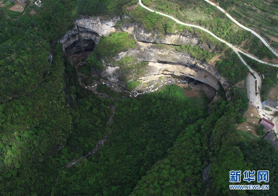 4月22日無人機(jī)拍攝的地洞河天坑。 新華社記者 張博文 攝