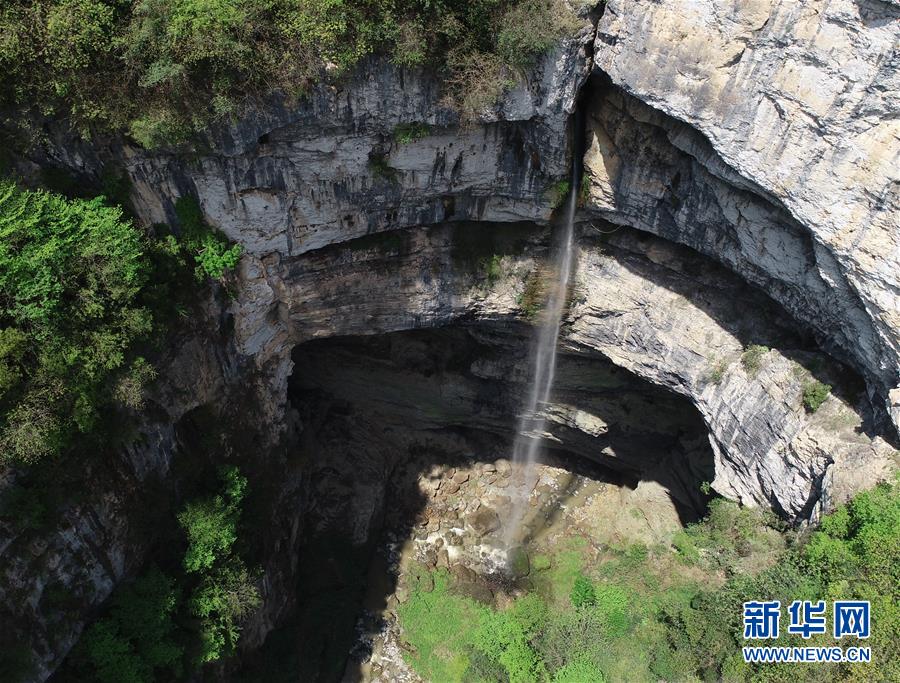 這是在陜西省漢中市寧強(qiáng)縣火石子村用無人機(jī)拍攝的地洞河天坑內(nèi)的一處瀑布。位于陜西省漢中市寧強(qiáng)縣的地洞河天坑,是禪家?guī)r天坑群中規(guī)模最大的一處天坑,坑內(nèi)分布有石鐘乳、石筍,具有極高的地質(zhì)研究?jī)r(jià)值。新華社 張博文 攝