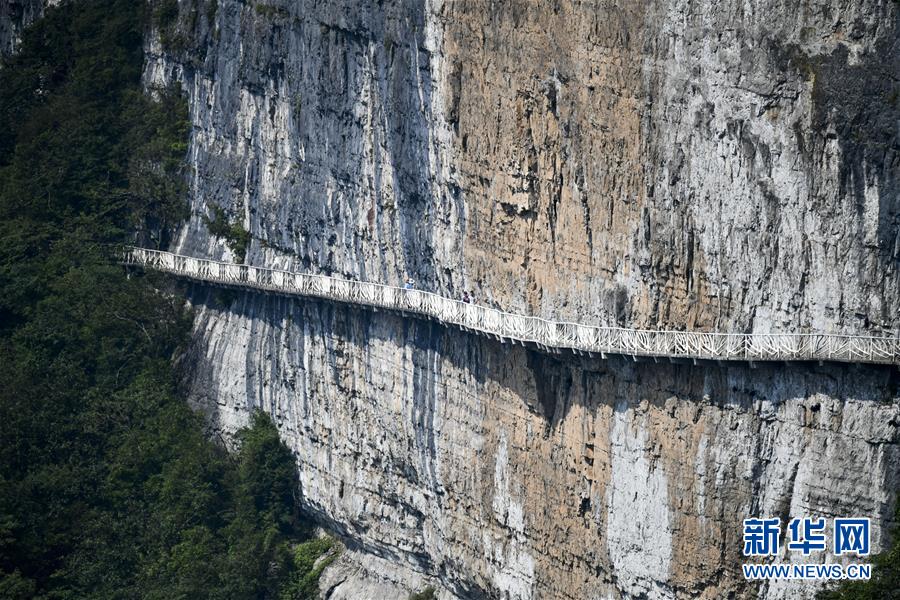 游客在重慶金佛山風景區(qū)內(nèi)的絕壁棧道上游覽體驗(8月20日攝)。 新華社記者 劉潺 攝