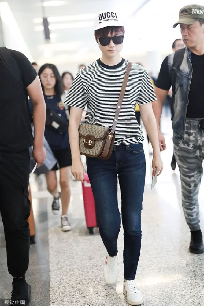 她身穿條紋T恤搭配牛仔褲,青春活力。頭戴棒球帽,黑超遮面,又不失酷感。