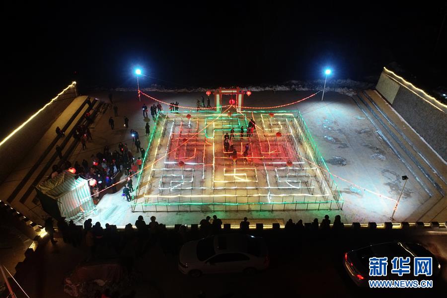 在武鄉(xiāng)縣大有鄉(xiāng)王莊溝村廣場上,村民們?cè)诰徘S河燈陣中觀燈(2月16日無人機(jī)拍攝)。 新華社記者 詹彥 攝