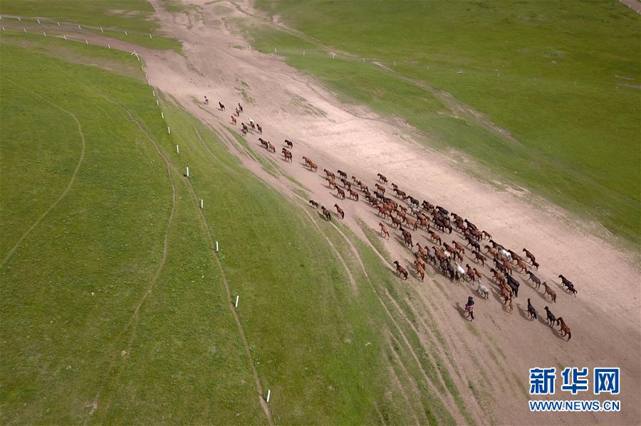 山丹馬場上的馬群(7月17日無人機(jī)拍攝)。新華社記者 范培珅 攝