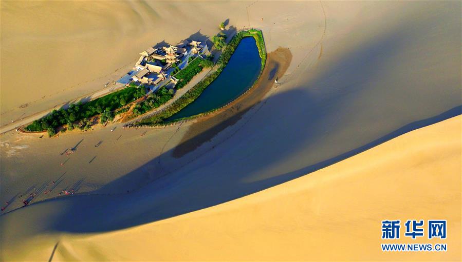位于敦煌市鳴沙山北麓的月牙泉(2016年9月9日無(wú)人機(jī)拍攝)。新華社記者 陳斌 攝