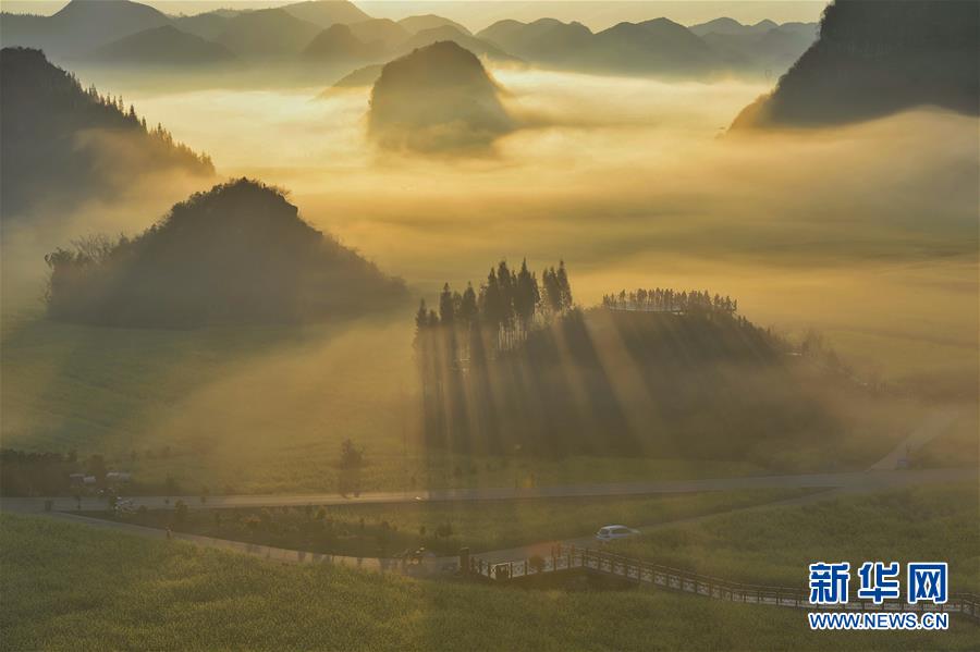 云南省羅平縣百萬(wàn)畝油菜花田一景(2月19日無(wú)人機(jī)拍攝)。 新華社記者 秦晴 攝