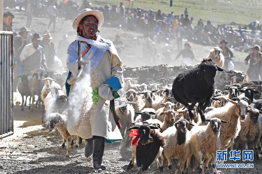 9月9日,羊群在進(jìn)入場(chǎng)地時(shí)牧民撒青稞祈福。李鑫 攝