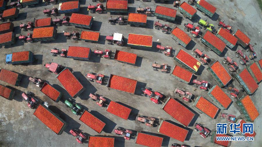 9月4日無人機(jī)拍攝的河套灌區(qū)三道橋鎮(zhèn)農(nóng)民向本地蔬菜加工廠排隊(duì)出售番茄。 新華社記者 劉詩(shī)平 攝