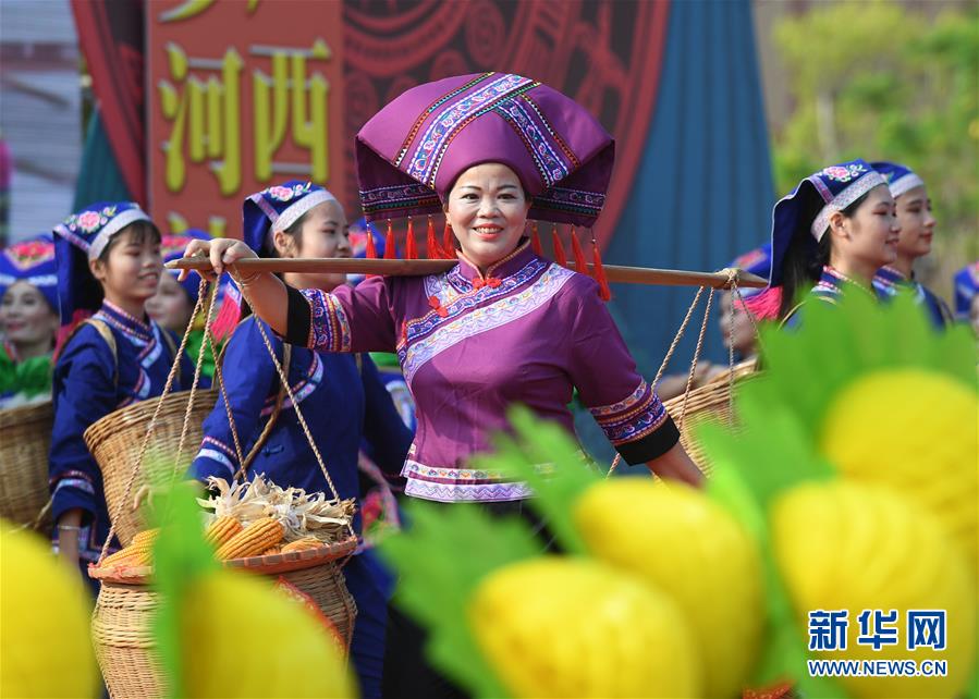 9月17日,廣西都安瑤族自治縣密洛陀文化公園廣場,演員在啟動(dòng)儀式上表演節(jié)目《在希望的田野上》。 當(dāng)日,2019年廣西慶祝“中國農(nóng)民豐收節(jié)”啟動(dòng)儀式暨河池市“慶豐收·促脫貧”系列活動(dòng)在都安瑤族自治縣舉行,各族群眾和來賓一起載歌載舞歡慶豐收節(jié)。 新華社記者 陸波岸 攝