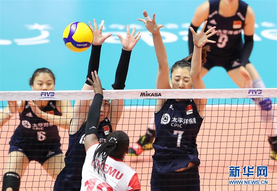 9月24日,中國隊球員姚笛(左二)和王媛媛(右)在比賽中攔網(wǎng)。當(dāng)日,在日本札幌舉行的2019年女排世界杯賽第二階段A組循環(huán)賽中,中國隊以3比0戰(zhàn)勝肯尼亞隊。新華社記者杜瀟逸攝