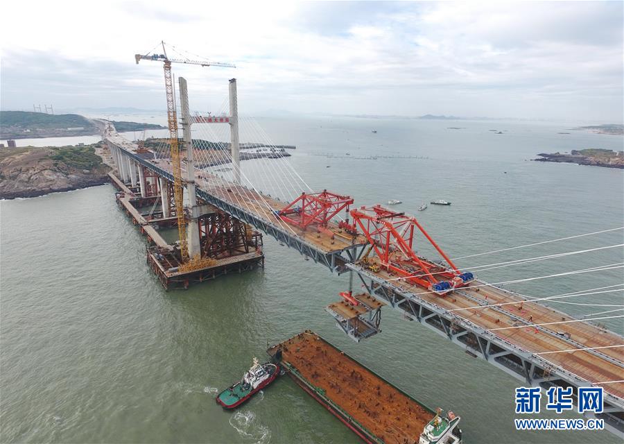9月21日,平潭海峽公鐵大橋鼓嶼門航道橋的鋼桁梁在吊裝中(無人機(jī)拍攝)。9月25日上午,隨著一段長17米、重473噸的鋼桁梁被精確固定到位,總長16.34公里的平潭海峽公鐵大橋合龍貫通。平潭海峽公鐵大橋是福州至平潭鐵路控制性工程,也是“十三五”規(guī)劃中北京至臺(tái)灣高鐵的先期工程。大橋起于福州市長樂區(qū),“踏”過四座小島后抵達(dá)中國第五大島平潭,上層設(shè)計(jì)為時(shí)速100公里的六車道高速公路,下層為設(shè)計(jì)時(shí)速200公里的高鐵。據(jù)福建福平鐵路公司介紹,大橋計(jì)劃2020年正式通車。在六年建設(shè)過程中,平潭海峽公鐵大橋所應(yīng)用研發(fā)的多項(xiàng)技術(shù)、裝備創(chuàng)下國內(nèi)外紀(jì)錄。新華社記者林善傳攝