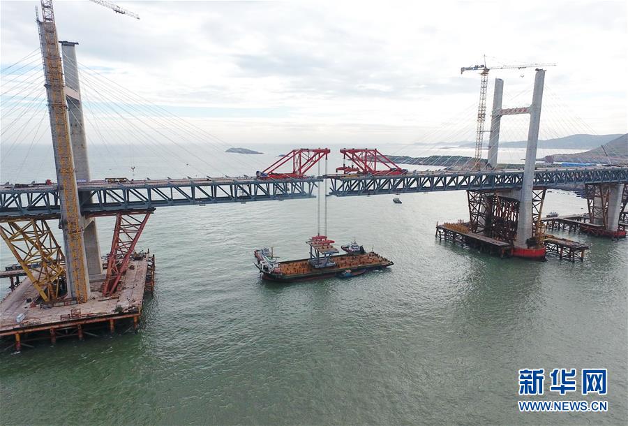 9月21日,平潭海峽公鐵大橋鼓嶼門航道橋的鋼桁梁在吊裝中(無(wú)人機(jī)拍攝)。新華社記者林善傳攝